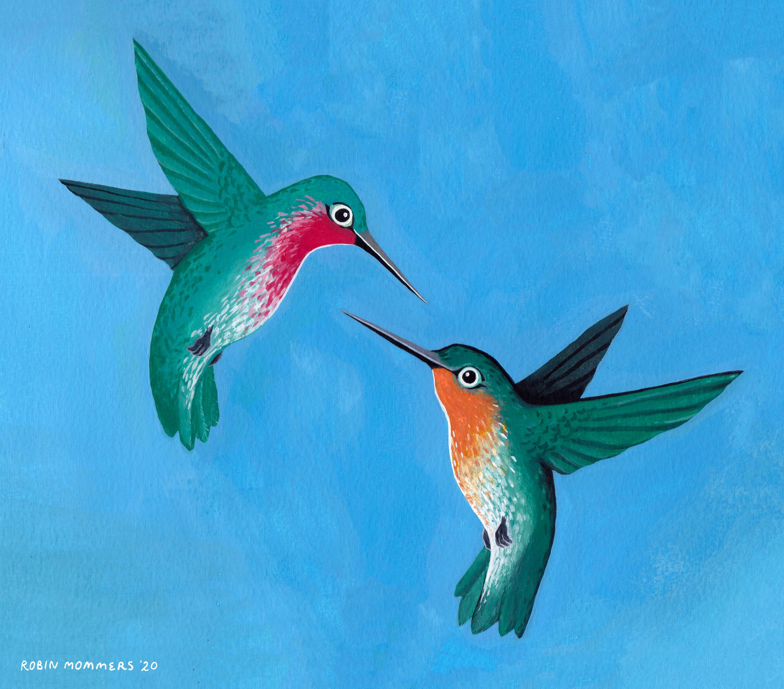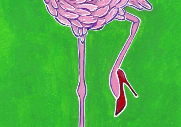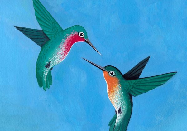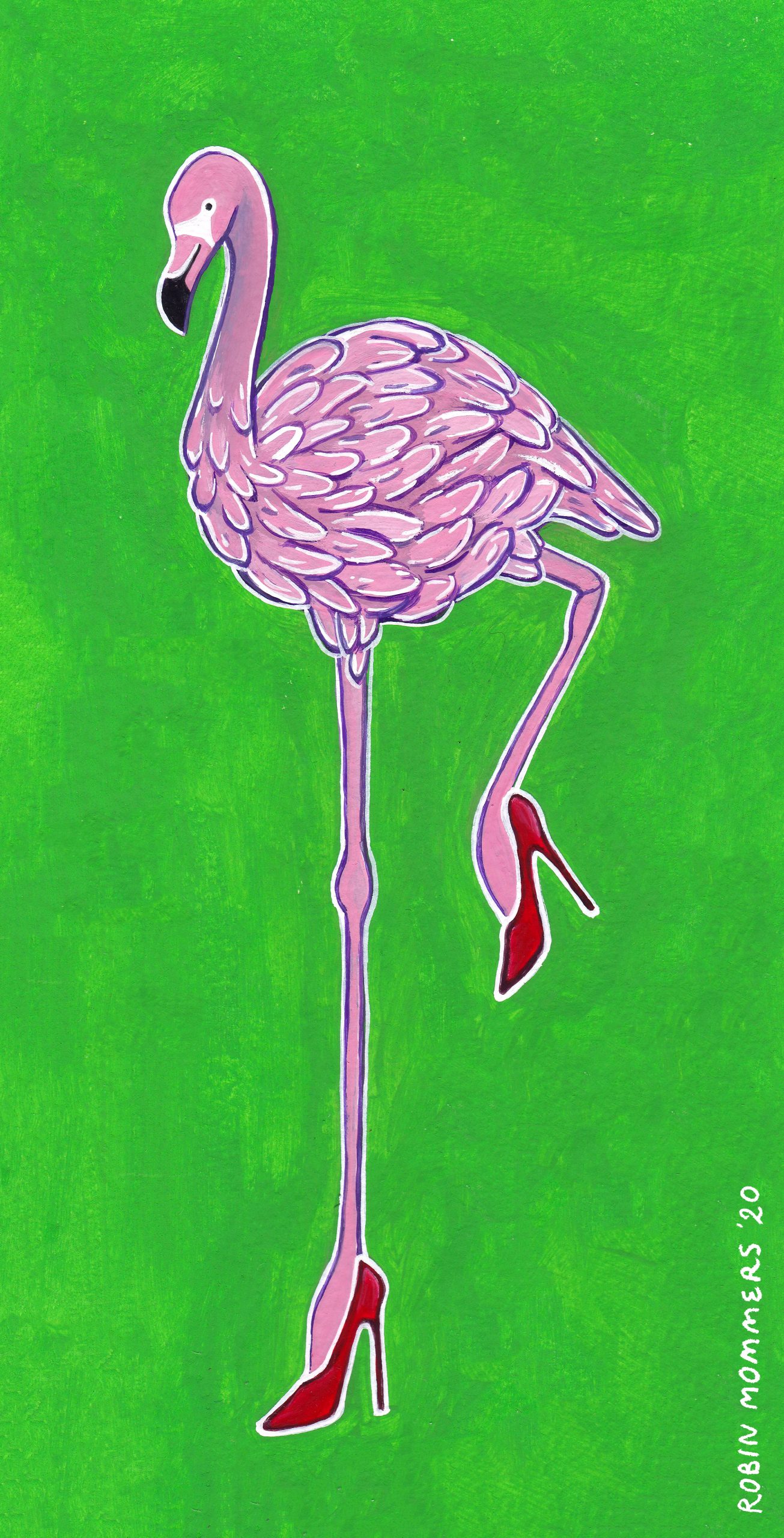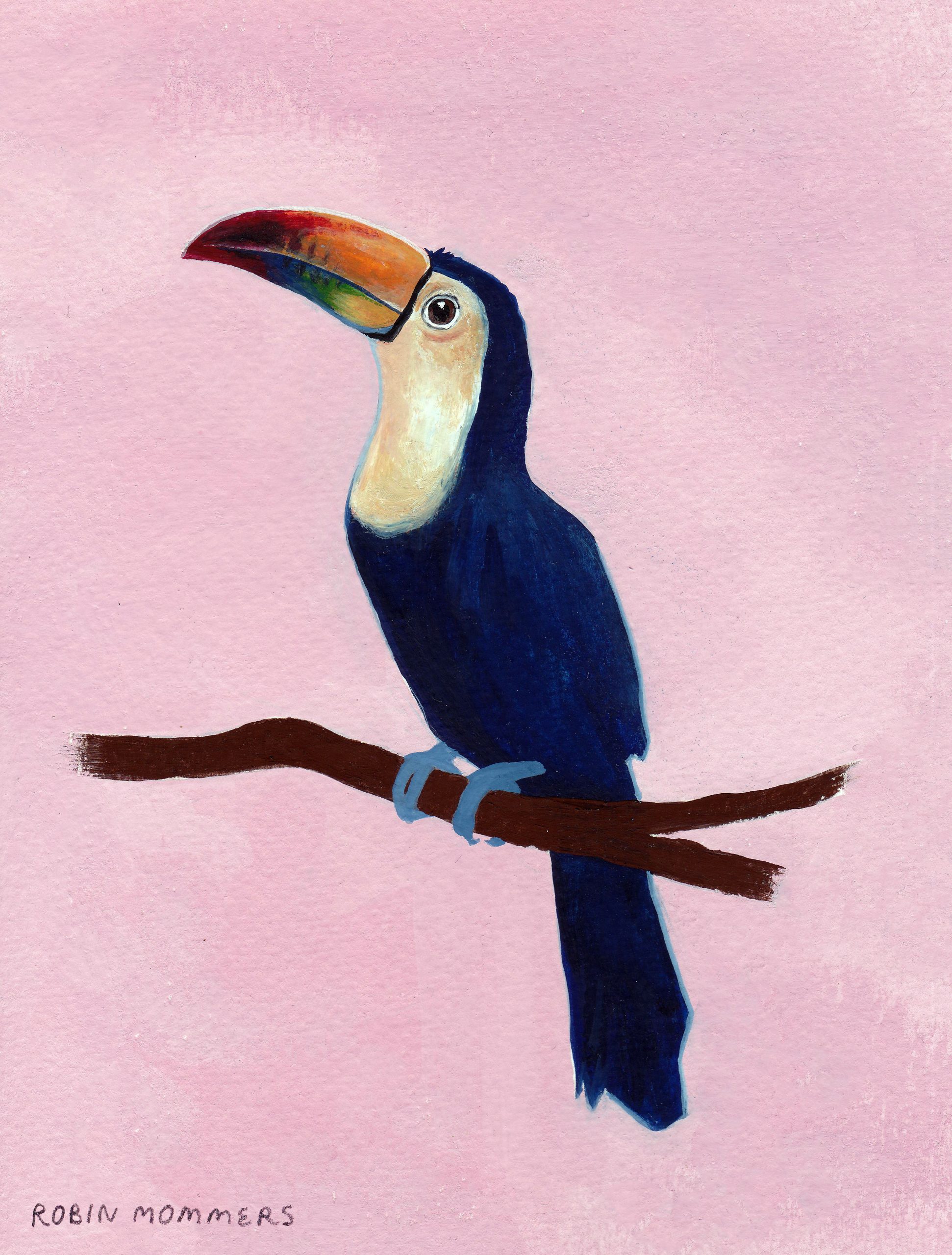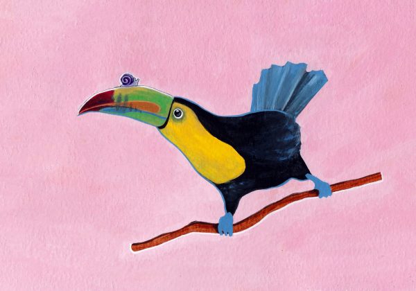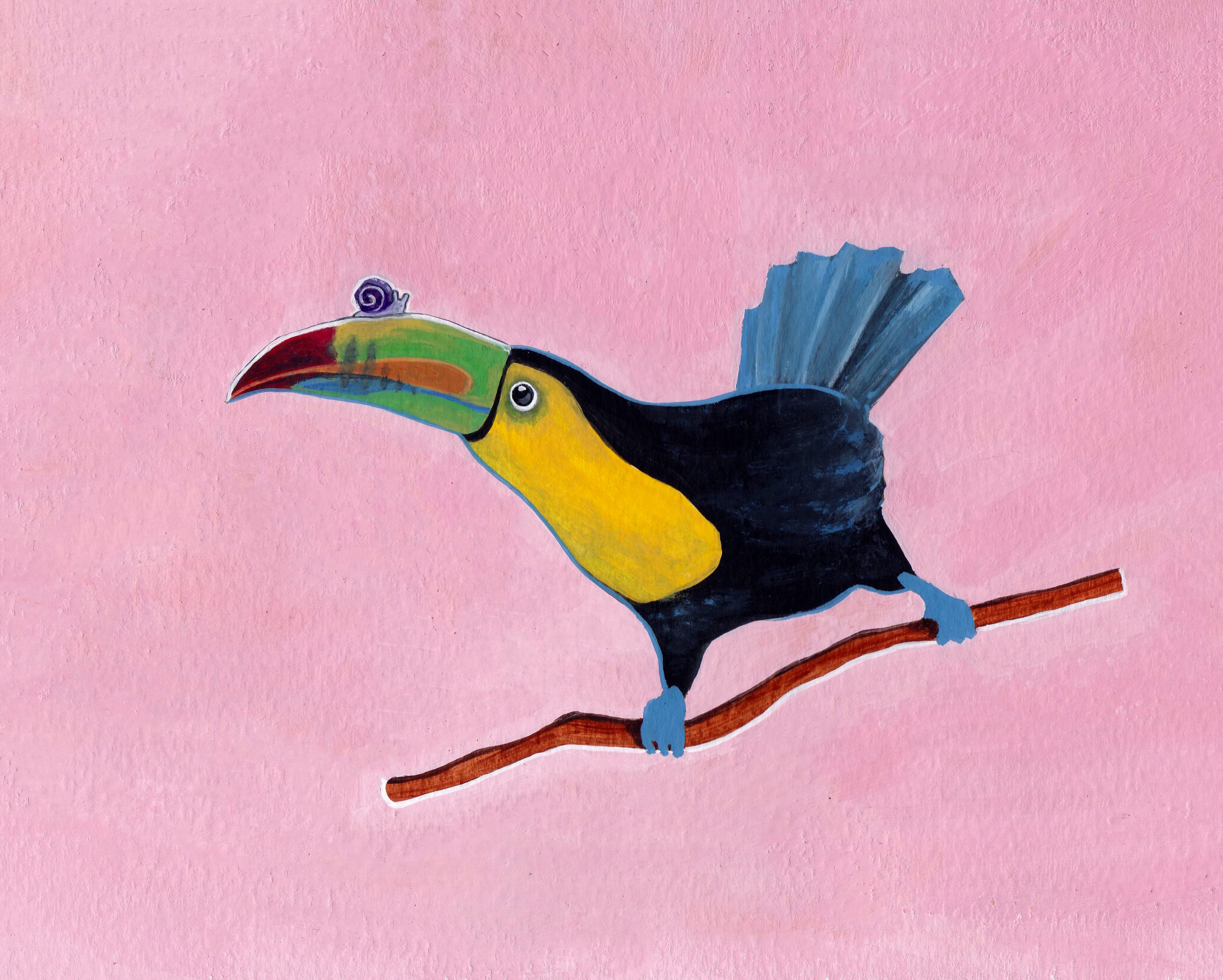 Some painted childrensbook characters. A little toucan Two hummingbirds Flamingo in heels Toucan with snail friend
